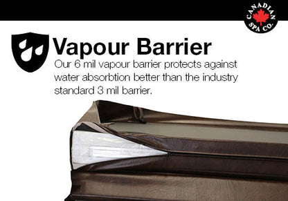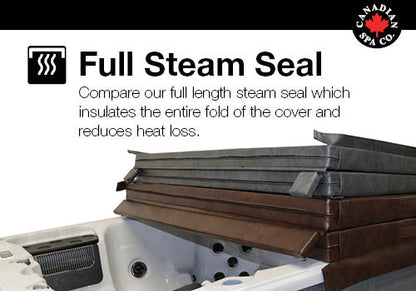 Our cover includes a full length Steam Seal inside the fold along with a 5" skirt to trap any excess heat that would escape through the side of the cover and keeps it within the hot tub. The bottom of the cover is manufactured out of mildew inhibiting vinyl to prevent moisture deterioration and provides minimal water absorption. These covers are designed to withstand harsh winter months.