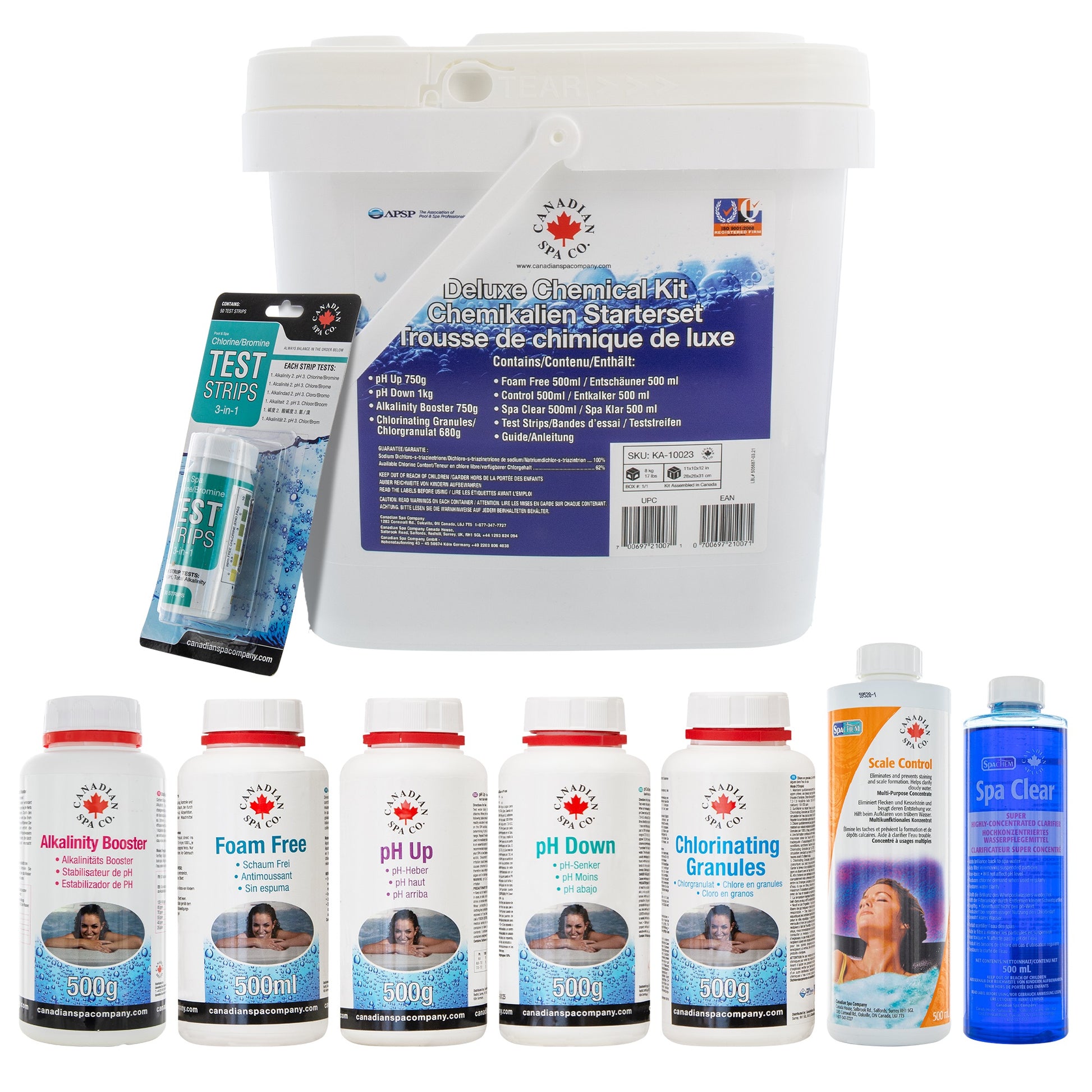 Canadian spa deluxe chemical kit, contains all you need to get you started, Contains pH down, pH up, foam free, scale control, test strips, alkalinity booster and chlorine granules.