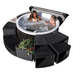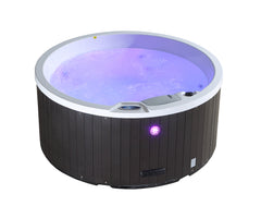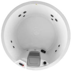 Ten Black Ice Moon jets driven by the same two-speed 2 HP pump that powers every other patio spa in our range, with air venturi valves at the rim to dial each jet's air injection up or down. 700 L of water runs through the 50 ft² Glacier antimicrobial filter; Mountain Pure™ UV-C + ozone sanitation, Balboa digital controls, triple-layer insulation with infra-red reflection, a 3″→2″ hardtop locking winter-rated black cover, multi-coloured LED mood lighting and ThermalSprings™ heat reclamation. Every feature that matters — just moulded into a round 160 cm shell instead of a rectangle.