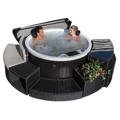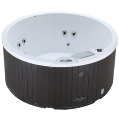Same patio-spa family as the Manitoba (14-jet rectangle) and the Muskoka (14-jet six-seat square) — identical 2 HP pump, identical Balboa controls, identical Mountain Pure™ sanitation, identical 12-month all-in warranty. The only real difference is the acrylic mould: Okanagan is the 160 cm round four-seater, Manitoba is the rectangle, Muskoka is the square. If your spot is small, awkward or round-shaped, this is the one — all-black cabinet and cover, 13 A socket.