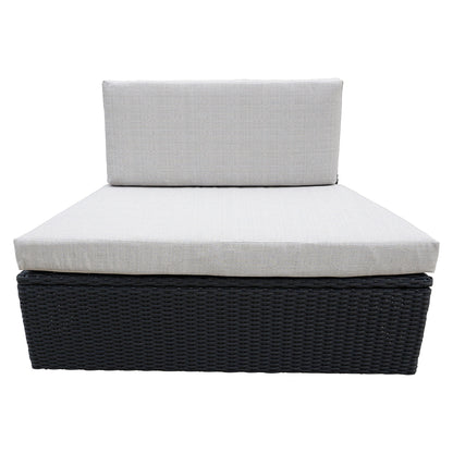 It features an attractive wicker finish, constructed of a durable, weather resistant, synthetic rattan over a rust-proof, heavy gauge aluminium frame. The seat cushion is upholstered with a comfortable, UV protected canvas.