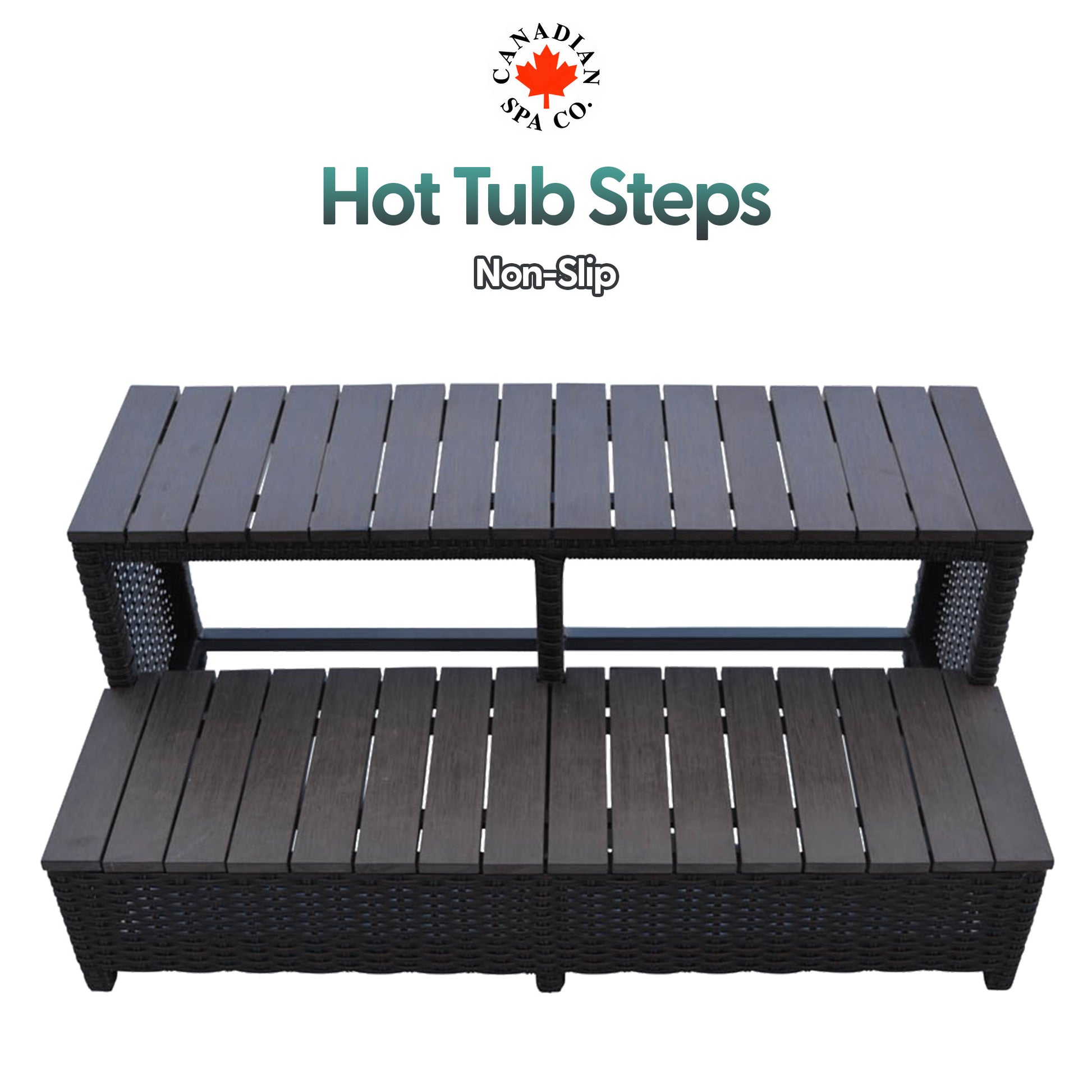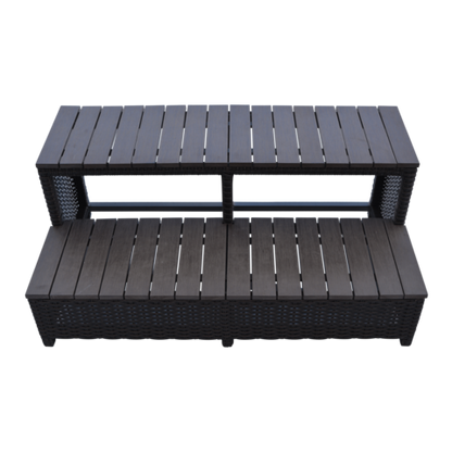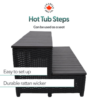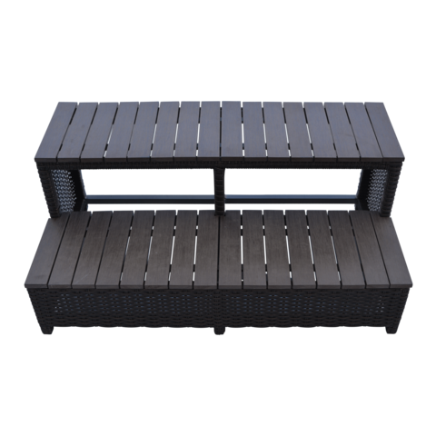 The Wicker Spa Step features double steps constructed of a slip resistant synthetic wood with an attractive wicker rattan finish along the border of the step. Multiple steps can be combined with our Square Spa Surround Corner Steps to create a wrap-around effect along the perimeter of your spa.